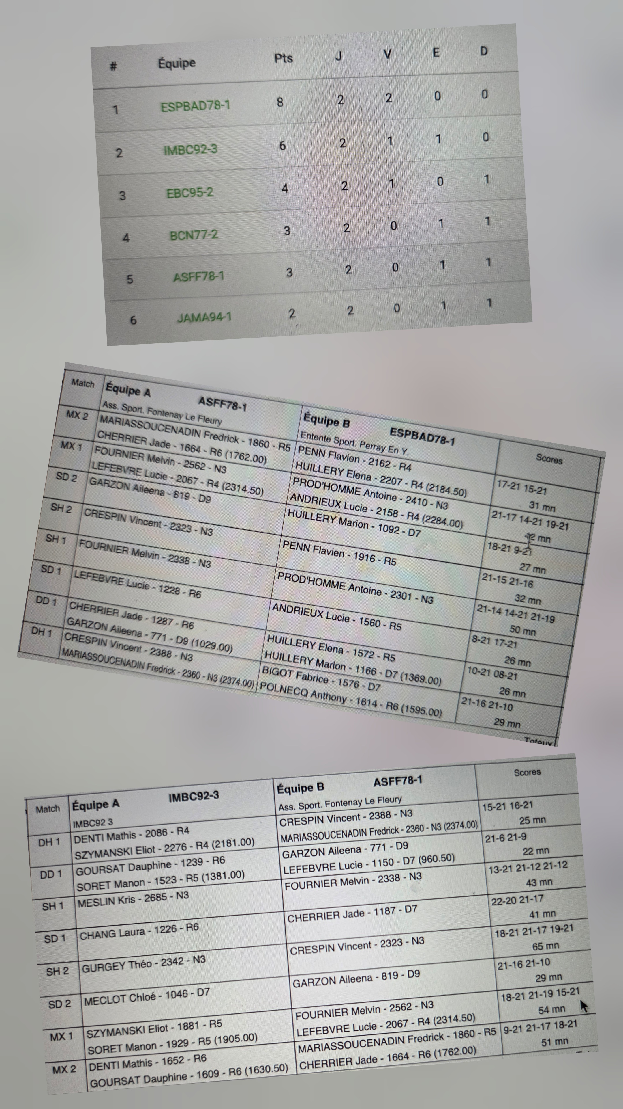 La première contre Issy les Moulineaux. Premier match maîtrisé du début à la fin avec Frédo en DH. ☺️ Le DD est plus compliqué pour nous. 1-1. 😥 On lance alors SH1 et SD1. Jade se bat bien et s'incline de très peu tandis que Melvin après un premier set magnifique perd peu à peu son jeu et doit s'incliner aussi contre un adversaire qui à su changer de tactique et le faire déjouer. 1-3. 😥 SD2 et SH2 lancé. Aileena s'incline logiquement et de mon côté je m'accroches comme je peu face à un adversaire qui ramène tout et après un match marathon de 65mn j'arrives à accrocher la victoire 21-19 au 3eme ce qui nous redonne un espoir : 2-4. ☺️ Reste les 2 mixtes et même scénario pour les 2 ou nos 2 paires remportes les premiers set avant de perdre les seconds et après 2 batailles nous remportons ces 2 matchs qui nous offrent le match nul. 4-4. 🥵 🥵 🥵